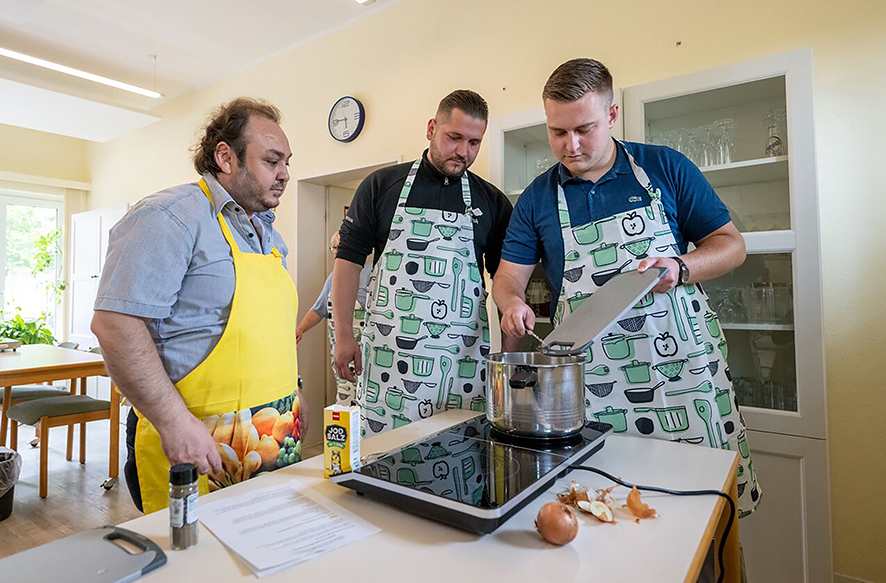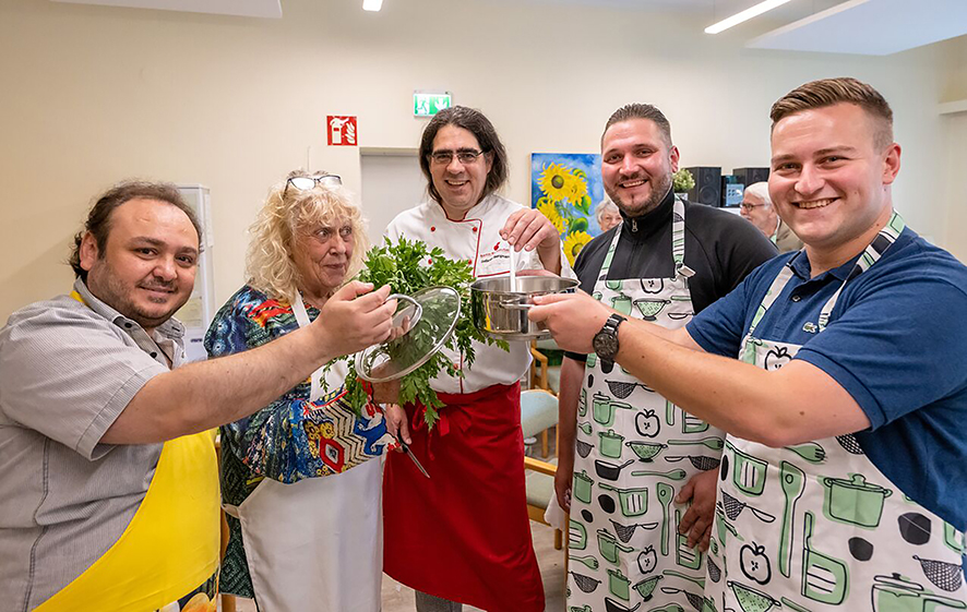 In dem multikulturell geprägten Quartier wohnen viele Mieterinnen und Mieter von Vonovia. Das Begegnungszentrum befindet sich ebenfalls in einem Gebäude von Vonovia. Die gebürtige Niederländerin weiß: Essen verbindet. Warum also nicht gemeinsam kochen? Über dem Begegnungszentrum wohnt der aus Syrien stammende Raed Ajloni. Er kann gut kochen, daher bittet sie ihn um passende Rezepte für ein syrisches Essen. Dann bringt sie ihn mit dem Kochdozenten Gabriel Bergmann zusammen, der bereits viele Kochkurse für die Volkshochschule organisiert hat. Der Abend steht.