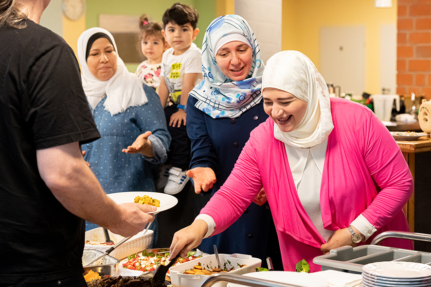 Bild links: Neven Katthab (r.) hatte die Idee zum Frühstück. Fatima Heli (Mitte) und Hala Housein sowie Dima Alhunbazli (nicht auf dem Bild) bereiten einmal pro Monat ein orientalisches Büfett vor.