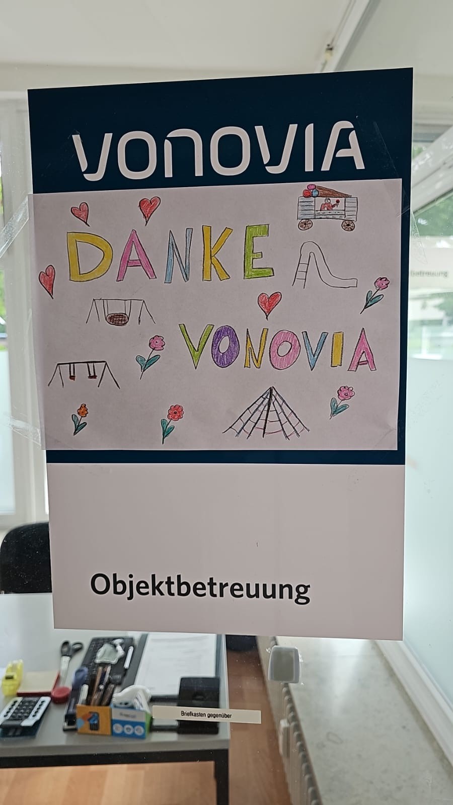 „Kinder sind wichtiger Bestandteil für ein lebendiges Quartier. Und damit sich junge Familien auch wohlfühlen, braucht es einen zeitgemäßen Spielplatz. Ich bin froh, dass wir das nun hier endlich in die Tat umsetzen konnten“, so Vonovia-Bewirtschafter Jörg Kruck, der weiter stolz berichtet: „Als wir ein paar Tage nach der Aktion ein großes selbstgemaltes Danke-Vonovia-Plakat, auf dem die neuen Spielgeräte und ein Eiswagen zu sehen waren an der Objektbetreuer-Bürotür vorfanden haben auch wir uns sehr gefreut.“