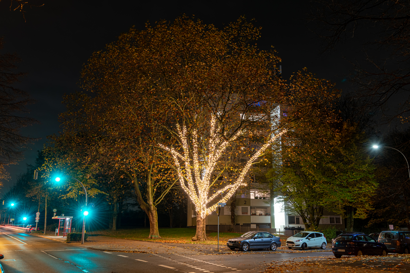 Die Lichterketten in den Bäumen schaffen nicht nur eine stimmungsvolle Atmosphäre, sondern sind auch umweltfreundlich konzipiert. Energiesparende LED-Technik sorgt für einen geringen Stromverbrauch, während die zeitlich begrenzte Beleuchtung nur in den Abend- und frühen Morgenstunden aktiv ist. So werden nachtaktive Tiere nicht gestört und die Umwelt geschont.