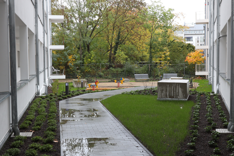 Herzstück des Ensembles ist der begrünte Innenhof, der durch die geschlossene Blockrandbebauung vom Straßenverkehr abgeschirmt ist. Hier können Kinder spielen, Nachbarn ins Gespräch kommen und die Bewohner Ruhe finden – ein Ort, der Gemeinschaft fördert und gleichzeitig Rückzug ermöglicht. Dank der Nähe zu öffentlichen Verkehrsmitteln, Einkaufsmöglichkeiten und Freizeitangeboten lässt sich das tägliche Leben bequem ohne Auto gestalten.