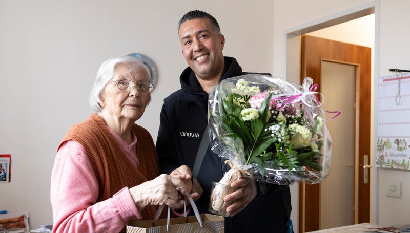Ein fröhlicher Blumenstrauß und eine Präsenttasche mit süßen Leckereien zum 45. Mietjubiläum: Objektbetreuer Noureddine Malrhi des Wohnungsunternehmens Vonovia überreichte kürzlich der 102-jährigen Mieterin Antonia Kliacko die kleinen Aufmerksamkeiten als Wertschätzung für ihre langjährige Treue.