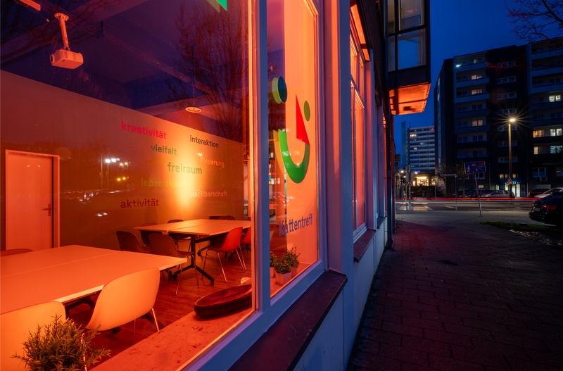 Am Nachmittag wurden die Aktionen dezentral in ganz Bremen fortgesetzt. Den Abschluss bildete am Abend die Beleuchtung verschiedener Orte in kräftigem Orange, darunter auch der „freiRaum Kattentreff“ sowie das Quartiersbüro in Kattenturm und der Kunstkiosk in Gröpelingen. Die Lichtaktion ist an die weltweite UN-Kampagne „Orange the World“ angelehnt, die jährlich rund um den Internationalen Tag zur Beseitigung von Gewalt gegen Frauen durchgeführt wird. „Mit der Beleuchtung unseres Quartiersbüros in Kattenturm möchten wir zusammen mit Vonovia ein klares Zeichen für Solidarität setzen. Gewalt gegen Frauen darf weder toleriert noch übersehen werden – sie geht uns alle an“ sagt Sandra Ahlers, Quartiersmanagerin in Kattenturm.