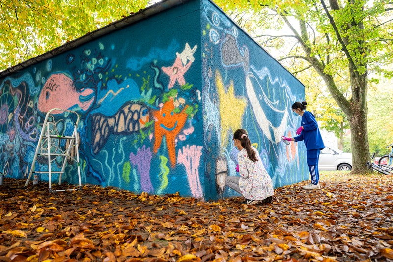 Aber auch die Kinder des Quartiers konnten ihre Ideen im Wohnumfeld direkt nebenan realisieren. Beim Graffiti-Workshop vom Quartierstreff Dodesheide-Ost und Vonovia zogen Korallen, Clownfische und ein Wal in die Schlesische Straße ein. Die Kinder verwandelten unter Anleitung der Künstlerin Vivian Blum mit der gesprayten Unterwasserwelt graue Flächen in einen lebendigen Blickfang. Die Leinwand in Form einer Trafo-Station hatten die Stadtwerke Osnabrück AG für die Aktion zur Verfügung gestellt.
