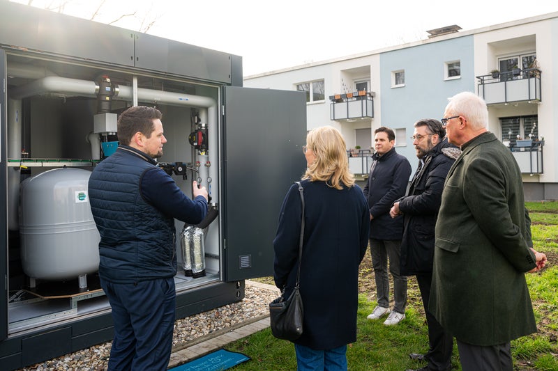 Am Oskarweg hat das Wohnungsunternehmen Vonovia eine containergroße Wärmepumpen-Anlage installiert, die das ölbasierte Heizsystem vor Ort komplett ersetzt. Das Bauelement enthält die gesamte Technik zur Wärmeerzeugung und nutzt Umgebungswärme und Strom, um klimafreundlich Wärme zu erzeugen. Klaus Afflerbach erläuterte der Staatssekretärin die technischen Details: „Aus einer Kilowattstunde Strom können wir mit dem Energiegehalt der Umgebungswärme vier Kilowattstunden Nutzenergie für die Beheizung erzeugen. So können wir die Energiekosten unserer Mieterinnen und Mieter um bis zu 40 Prozent senken.“