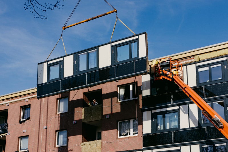Was auf den ersten Blick spektakulär wirkt, ist Teil eines zukunftsweisenden Modernisierungsprojekts. Mit der seriellen Modernisierung nach dem Energiesprong-Prinzip wird hier gezeigt, wie sich bestehende Wohngebäude schnell, effizient und klimafreundlich modernisieren lassen – und das, während die Bewohnerinnen und Bewohner weiterhin in ihren Wohnungen leben.
