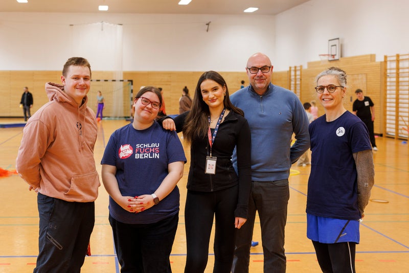 v.l.n.r.: Simon Wykhoff, Celina Petereit und Emily Kaul, Mitglieder des Schlaufuchs Berlin e.V., Matthias Strachardt, Regionalbereichsleiter bei Deutsche Wohnen, und Jana Weidlich, Kooperationsmanagerin bei Schlaufuchs Berlin e.V.