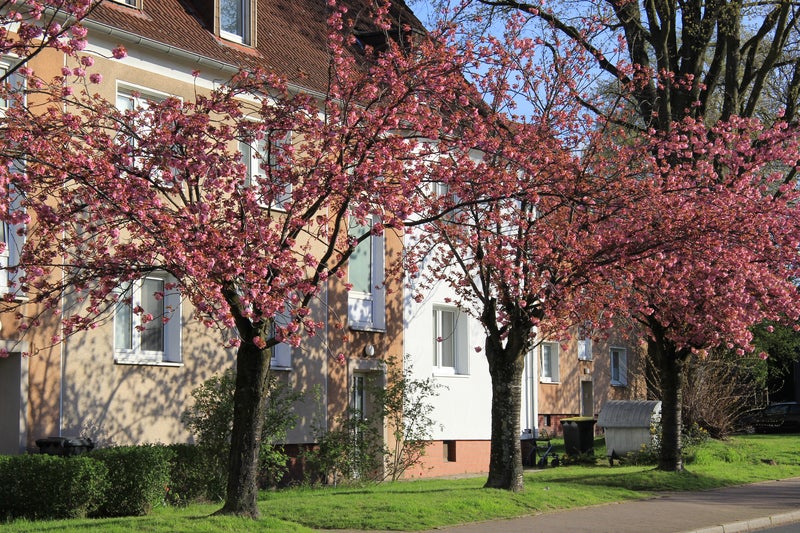 Rosa Blütenpracht, soweit das Auge reicht: In Gladbeck steht das Vonovia Quartier Rosenhügel wortwörtlich in voller Blüte. Zum Frühlingsbeginn schmücken die beliebten Kirschbäume die Straßen und locken Anwohnerinnen und Anwohner. Die prächtigen Bäume sind nicht nur ein echter Hingucker, sondern auch ein wichtiger Bestandteil der Wohnumfeldpflege, mit der Vonovia für ein lebenswertes Zuhause im Quartier sorgt.