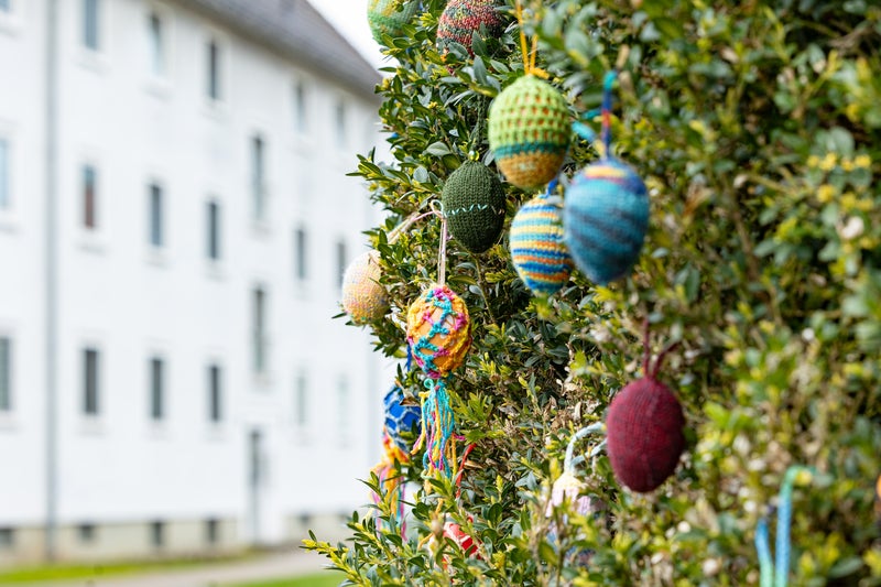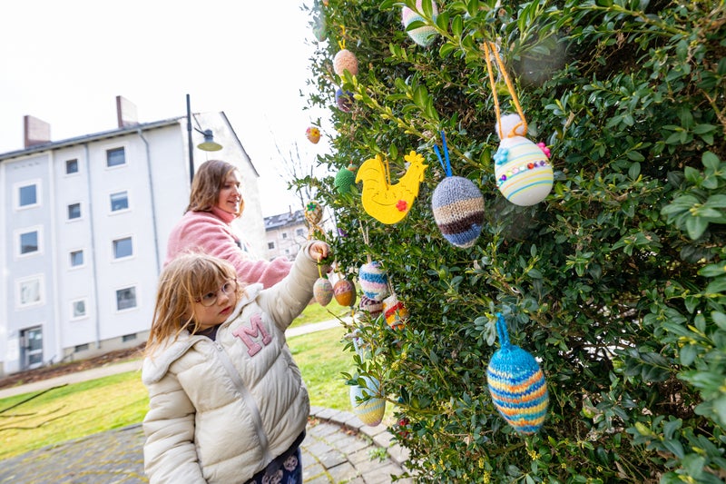 Die Idee entstand in der Vonovia Quartierssprechstunde im Quartiersbüro an der Henschelstraße 12. Dort trafen sich engagierte Bewohnerinnen und Bewohner, um gemeinsam kreativ zu werden und erste Ostereier zu gestalten. Schnell entwickelte sich daraus ein Projekt für die gesamte Nachbarschaft: Alle waren eingeladen, zuhause Eier zu basteln, zu häkeln oder zu stricken, um sie schließlich gemeinsamen aufzuhängen.